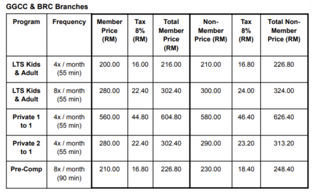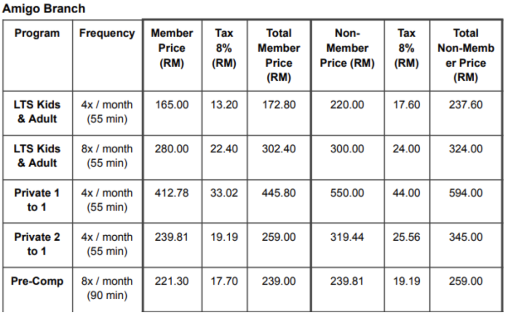 • Pre-Competitive (4x/month, 90 mins): RM239.00 (member), RM259.00 (non-member)